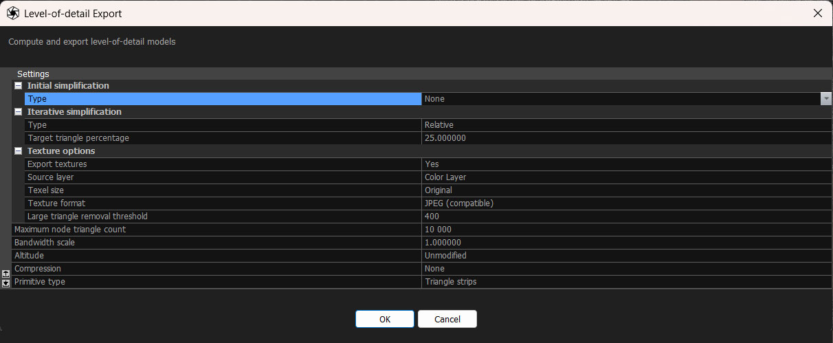 • Initial simplification: This lets you simplify the model before exporting. This directly controls the maximum detail that can be found in the exported model.